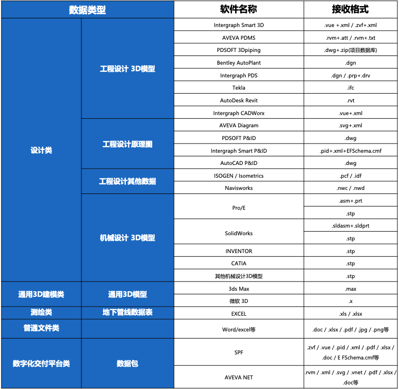 私有格式,包括RVT(Revit)、VUE(Smart3D)、RVM(PDMS)等,⼀般为某软件特有的文件格式,其格式定义并未进⾏公开。私有格式通常完整记录了CAD数据,因此解析私有格式成为了绝大多数客户的重点考察技术,相比国内友商,互时科技的多源异构CAD格式解析技术覆盖格式更广,对私有格式兼容性强,能够解析拓扑关系并自动转换语义,技术水平直接对标美国Intergraph和英国AVEVA。