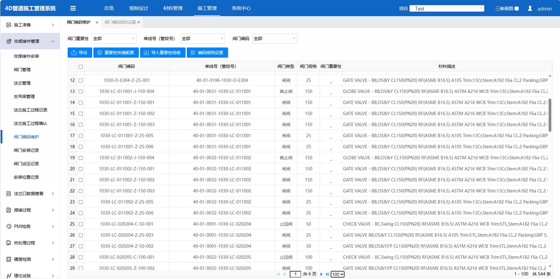 在项目实践中,阀门到场须经现场压力及密封性测试,传统流程于实体试压成功并提交试压报告后即告终结,随后阀门投入安装使用。然而,当涉及同类、同尺寸、同批阀门数量庞大时,现有文档体系暴露出局限性,无法有效追踪每个阀门的具体安装点位。一旦阀门出现质量问题,追溯同批次安装位置成为难题,运营期间亦难以实施精准的原位拆装检修,影响维护效率与安全管理。