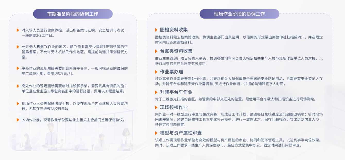 在数字管网实施过程中,需要与工程公司对接建设标准,与设计单位对接并核实建模所需各类数据,与业主各部门协调无人机航飞备案、图档台账资料收集手续办理、高处作业手脚架搭设等各类工作。