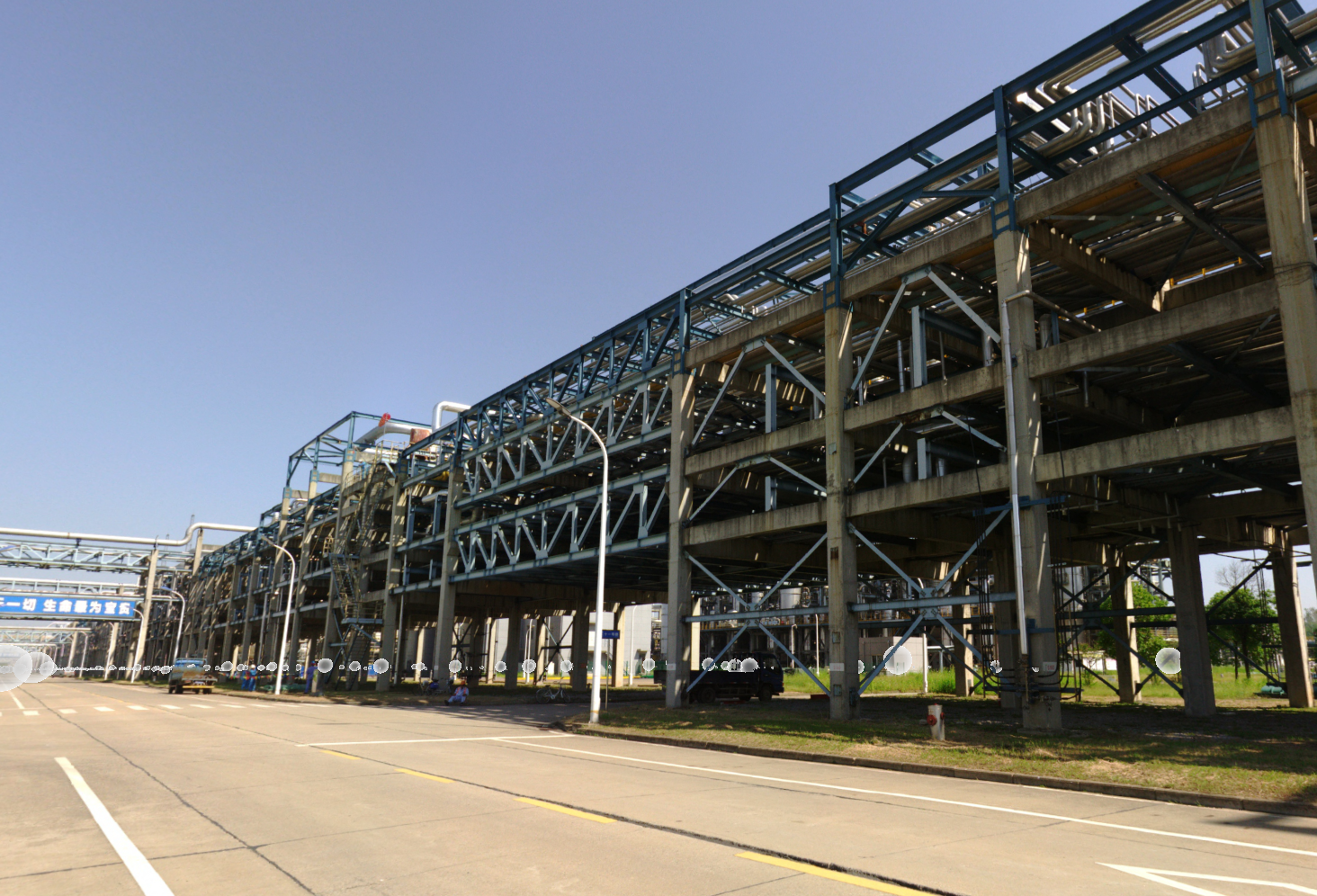 以上图为例,该位置为某企业不同走向管廊的交汇处,双排管廊纵横交错,横向跨距25米,纵向跨距100米,站在管廊下方甚至看不见太阳,是该项目中测绘工作中最难开展的地方,无人机、激光扫描等一般测绘手段都无法获取管廊的空间参数。