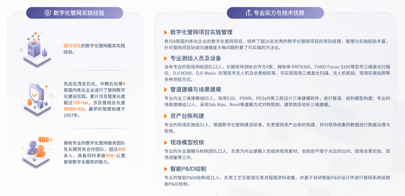 互时曾与中石化公司及中石化工程公司多次紧密合作,培养了16名优秀的数字化管网项目经理和30余名专业的现场实施人员,针对各类复杂作业均具备丰富的协调和实践经验,且熟悉管网建设项目中的各项重要节点,清晰了解设计院建模的数据要求,能够进行合理的统筹安排,保证项目高效率推进的同时,大幅减少企业参与的工作量和人手。