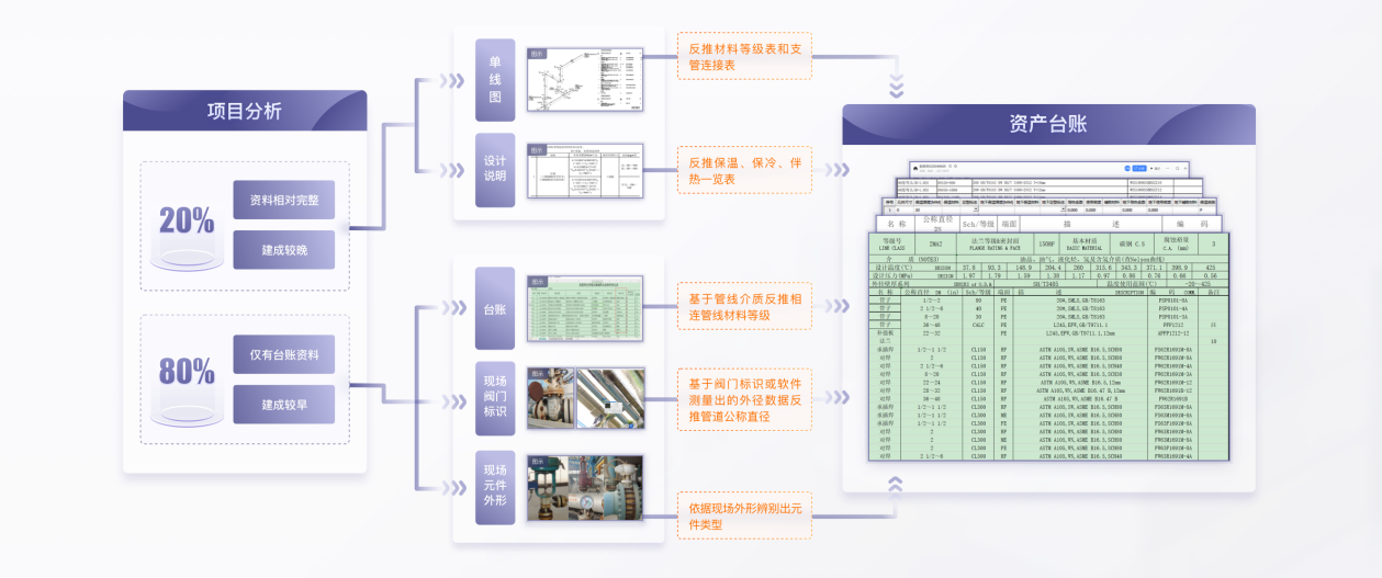 以某炼化企业为例,经现场测绘共梳理出6000多条管线,而企业业务部门接近2000多条管线的资料完全遗失,仅能提供约4000条管线的台账,且所提供的台账也只能覆盖部分工艺信息,缺失大量的工程信息。