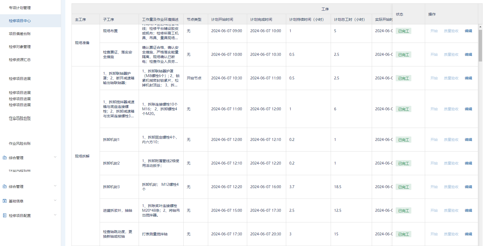 那我们这次把工序拆解到小时级,每天的计划就按小时来分配,它可以监控到每个小时的计划执行完成情况,进度偏差就很好把控,可以及时根据现场情况来调整检修策略。所以这次计划的准确率就达到了75%以上,以至于最后比原计划还要提前两天,都要归功于小时级工序清单的功能。