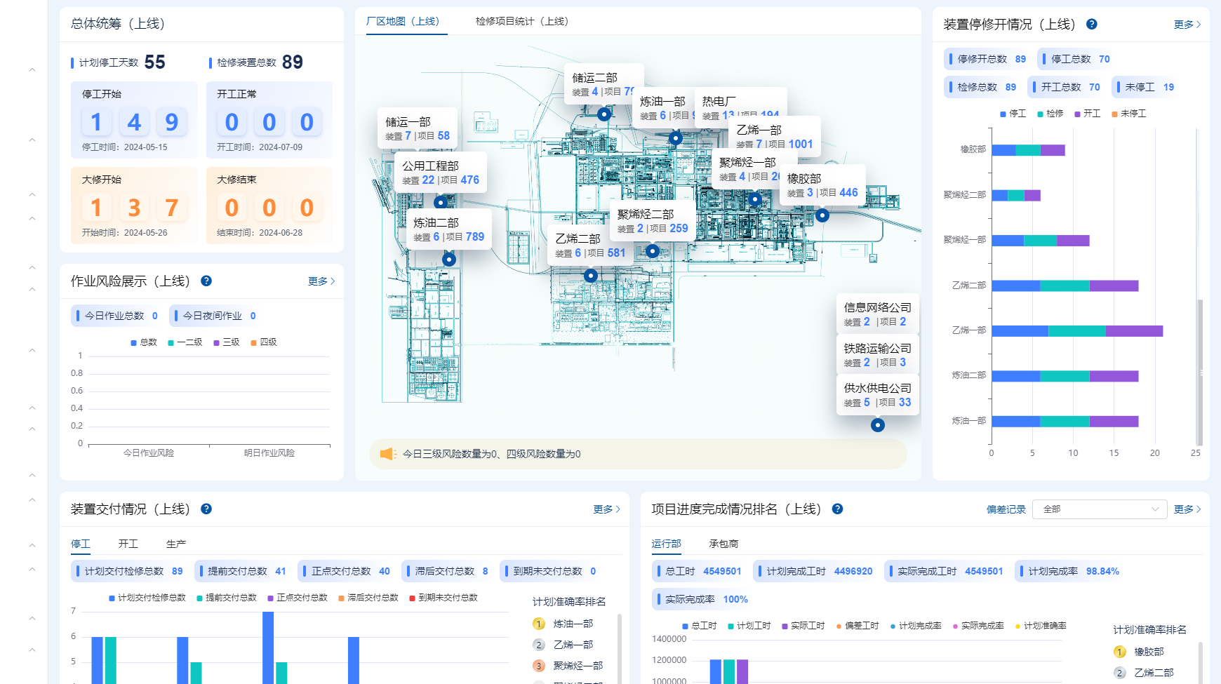 因为对于检修最有经验的其实是企业的机动设备处,所以此前检修项目都是由机动设备处在一线直接管理,更偏重于执行,就很难有整体全局的管理视角。现在有了我们的平台,机动设备部就直接坐镇后方,利用大修平台实时关注检修进展,基于经验去指导各个运行部,提供决策支撑,而由运行部深入大修一线去主导推进检修实施。