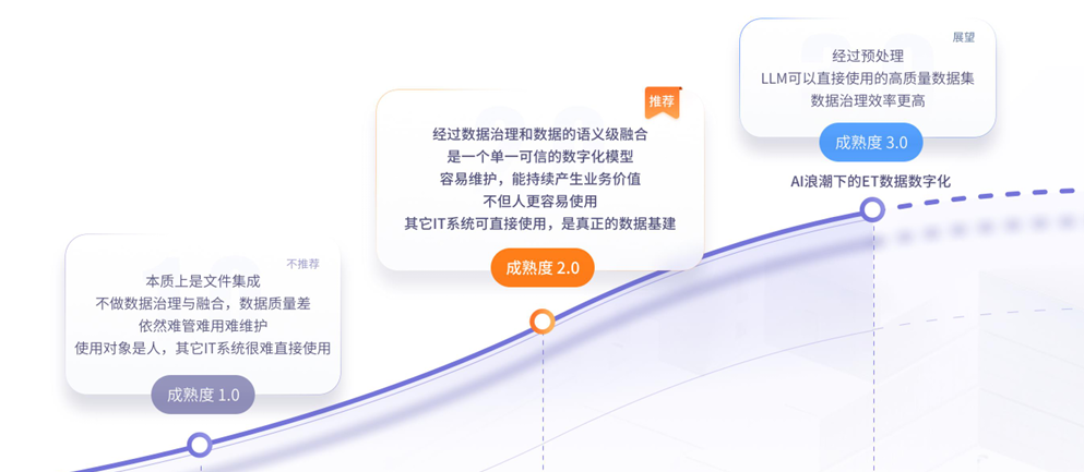 互时科技迄今在多个行业已交付近百个数字化交付项目,拥有丰富实践经验。基于总结与思考,我们主要围绕当下存在的最突出矛盾,也就是数据质量与可用性的问题,提出了数字化交付成熟度的概念,将其划分为三个不同的发展阶段,分别是1.0、2.0、3.0, 每个阶段核心特征不同,用户价值逐层提升。
