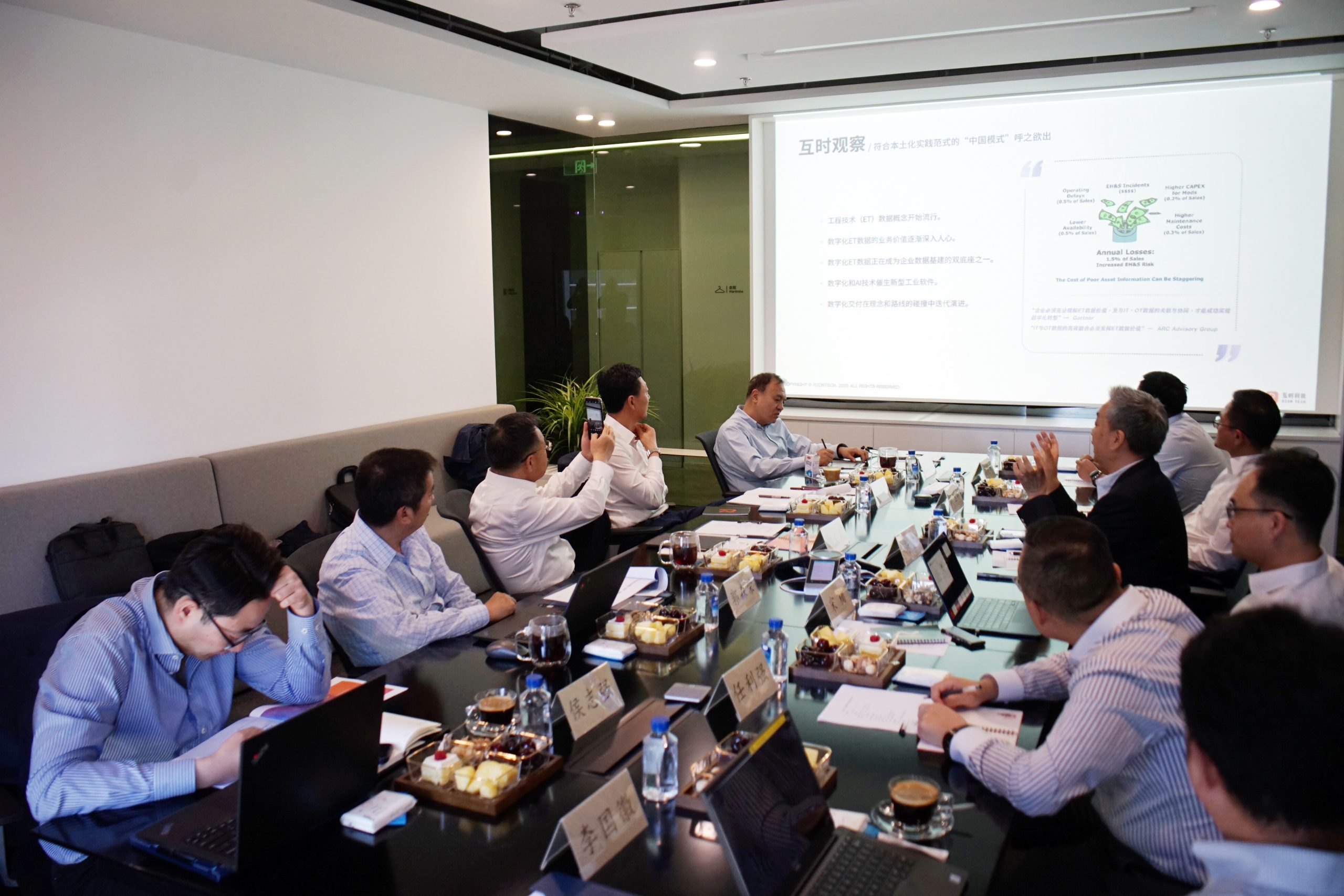 中国石化工程部总经理向文武 此次调研,双方就数字化交付与应用、单一可信数据源构建、AI赋能工程建设等开展交流,进一步推进工程建设高质量发展。 互时科技向中石化考察团汇报 在交流中,双方聚焦数字化 ET 数据价值深度发掘、数字化交付实践难点梳理与破解、施工驱动型 AWP 高级工作包创新构建、数字技术与 AI 赋能工程建造前沿路径探索、单一可信 ET 数据源体系搭建、工程技术数据后处理核心技术攻坚以及数字化成果全生命周期运维管理优化等关键议题,开展了多维度、深层次的专业研讨。